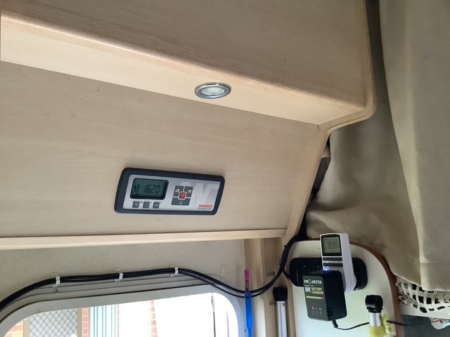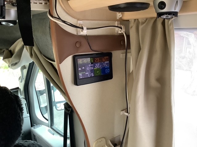 Weather station mounted on roof of motorhome with monitor screen inside motorhome.