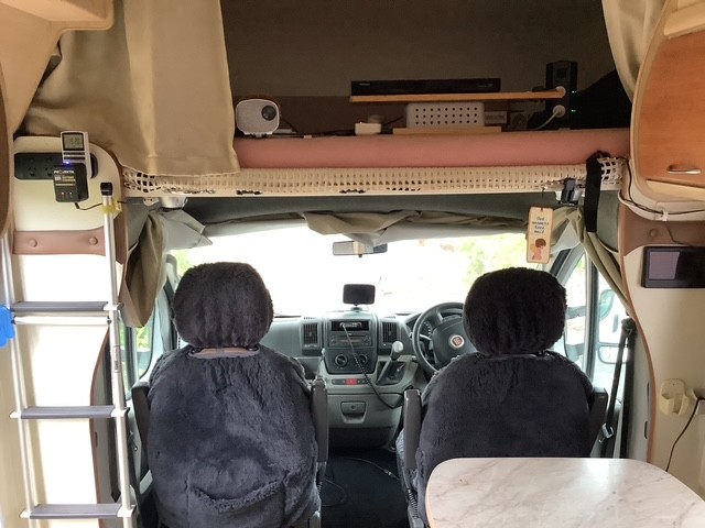 2 swivel chairs in driving cabin with lambs wool covers