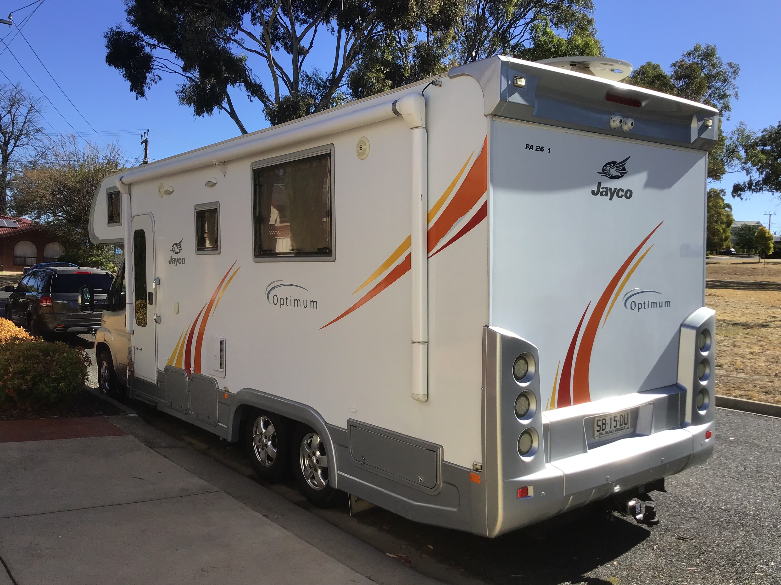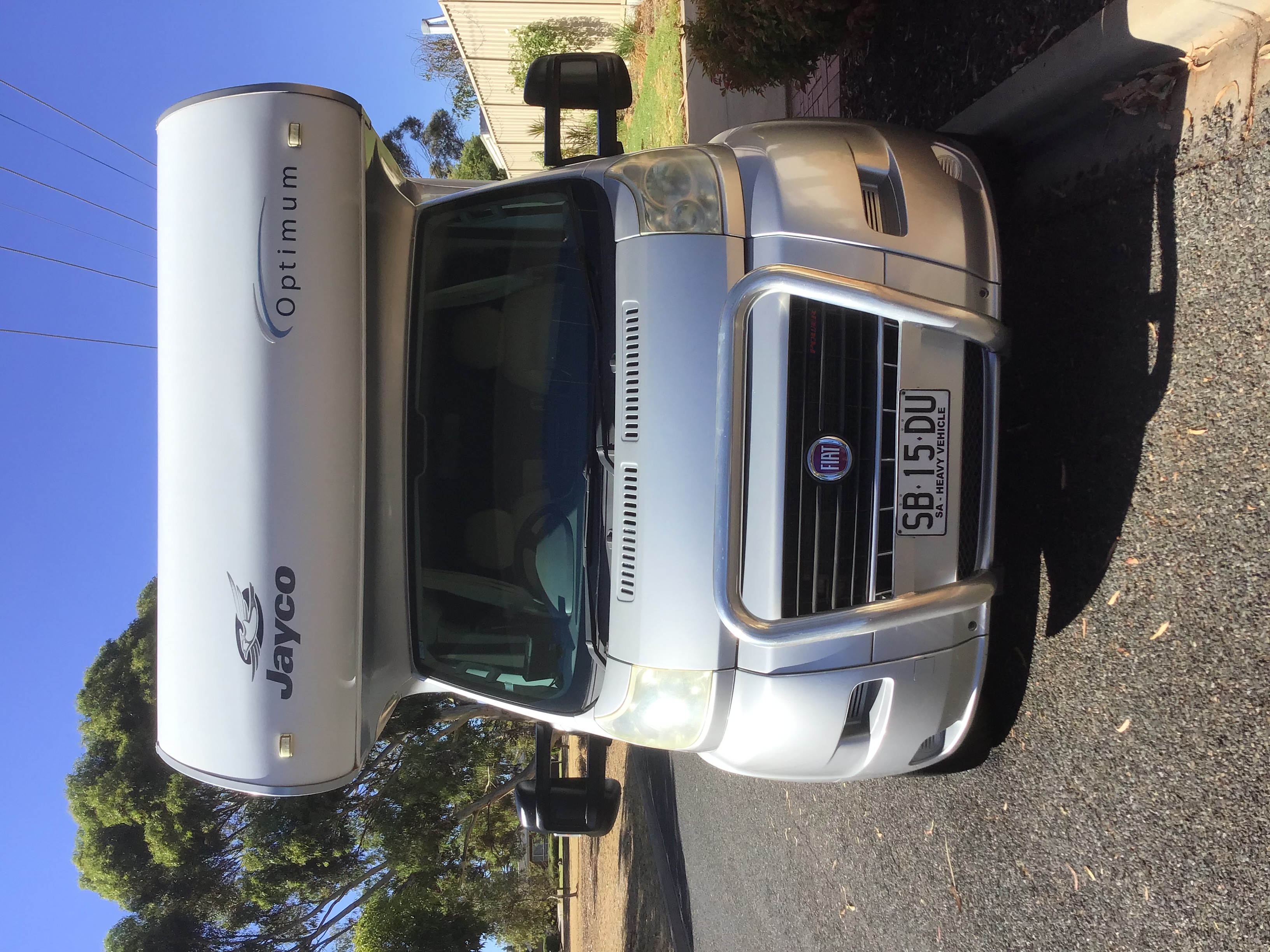 YEAR 2011 MAKE Jayco MODEL Optimum FA 26-1 DESCRIPTION Fiat Ducato 3Lt Turbo, 4 Berth, 140000Klms, FEATURES 186Lt 3way Fridge/ Freezer, Gas/Electric hot water, Smeg Gas/ Electric Hotplates, Grill and Oven, microwave, Ibis R/C aircon, 3Kg Washing machine, Esuite w separate shower and toilet, Slideout QS bed, all leather upholstery, 120w Solar Panel, Electric Awning, Electric Step, Nudge bar, Tow Bar, External Gas Bayonet, mouldings painted with 2Pac paint to match Fiat colour, upgraded heavy duty springs, new shockers, 2 new house batteries, motor home cover. PRICE $105000. CONTACT Ph 0408089214 Email maidasob29@gmail.com