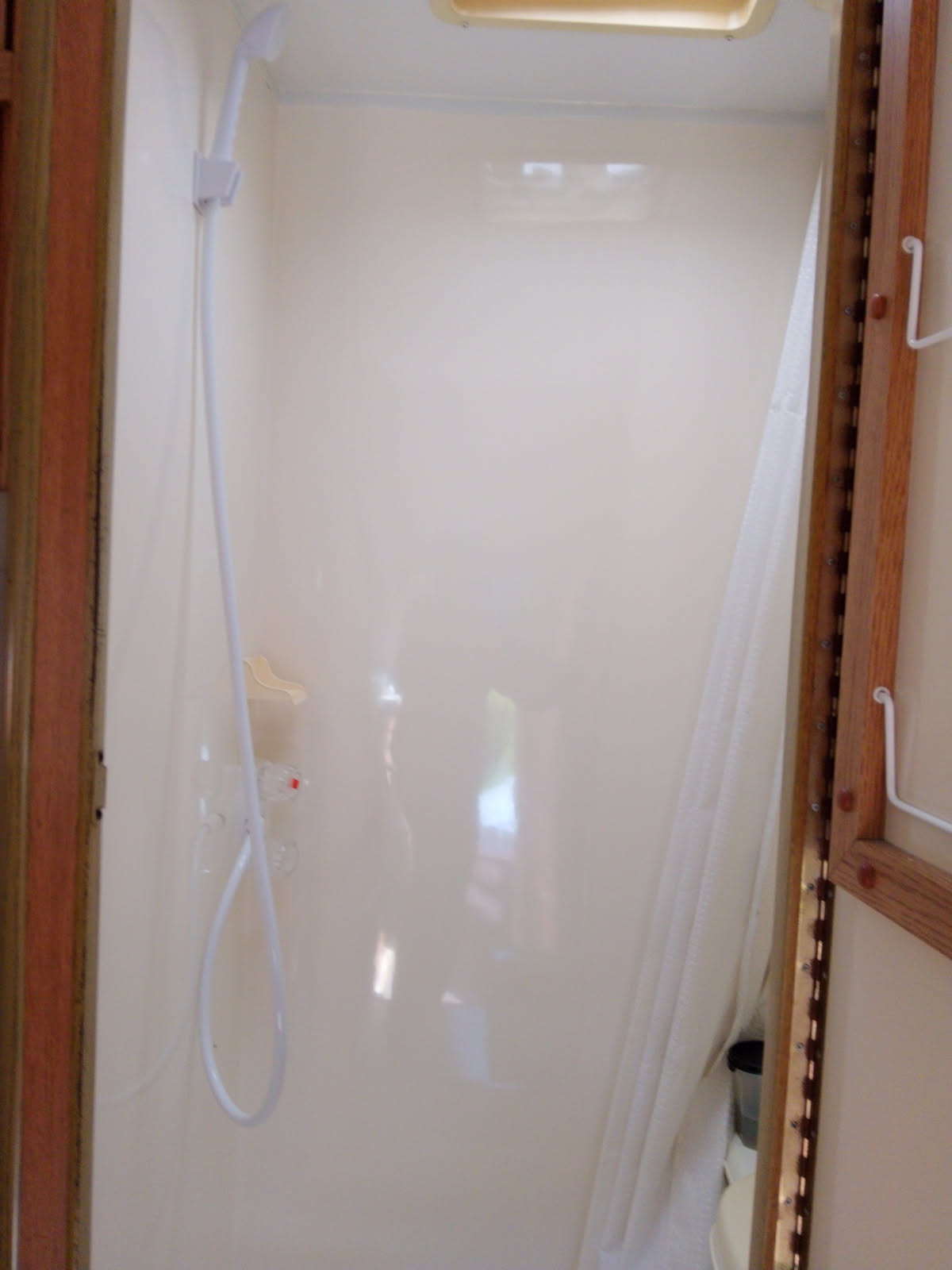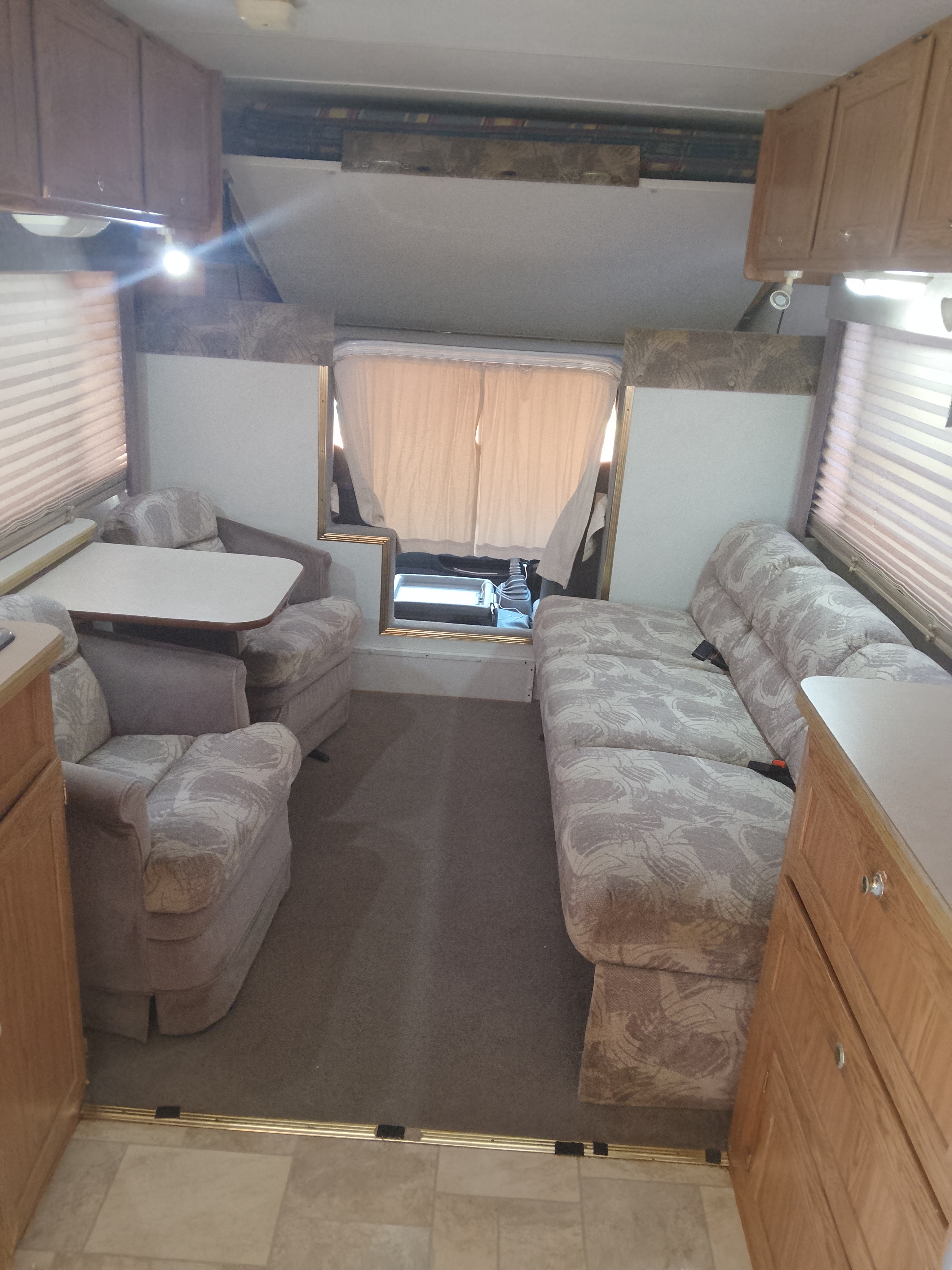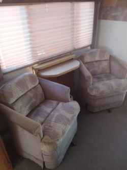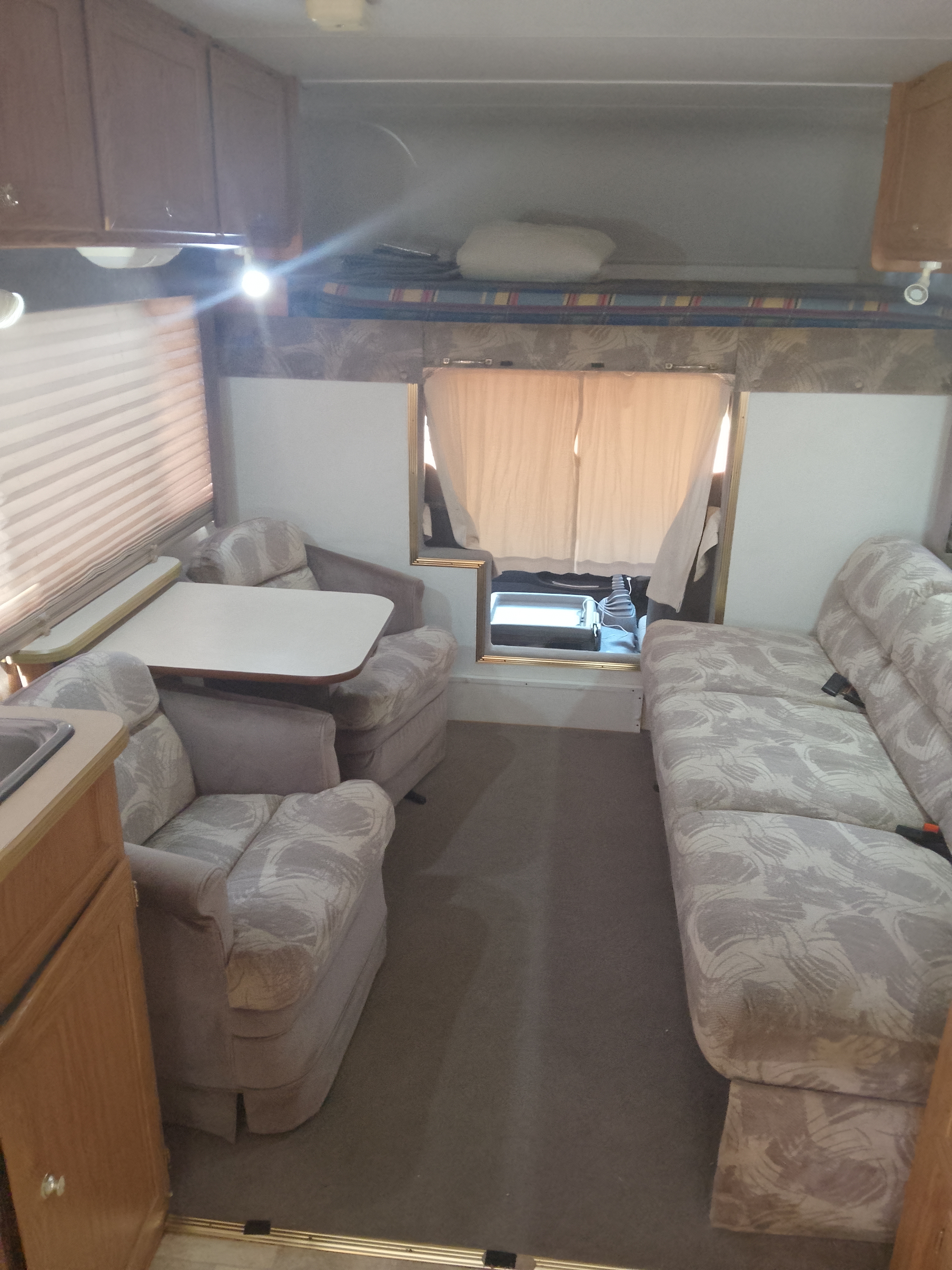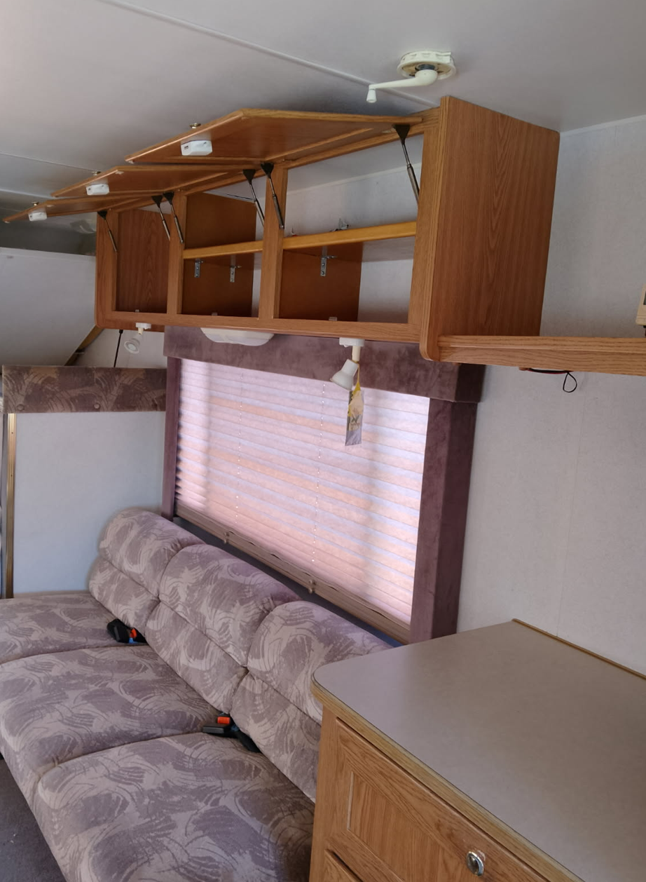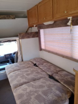 This layout includes a queen Luton bed, a 3-seater lounge which converts to a double bed, and 2 swivel chairs, a fold-up table. A 4-burner gas stove and oven and grill, a combined shower toilet which has a 17L cassette tank. There is 122L of fresh water and 81L grey water tanks. Plenty of cupboard space. A 12V 14-inch TV with aerial, CB radio, 3-year-old JVC radio which allows hands-free phone, reversing camera. The standard curtains have been replaced with day and night blinds.