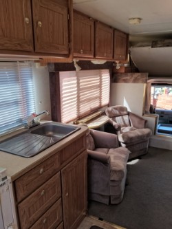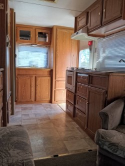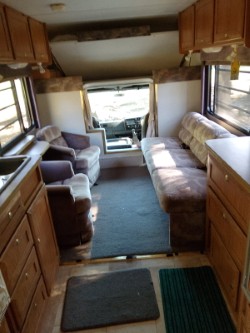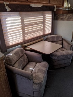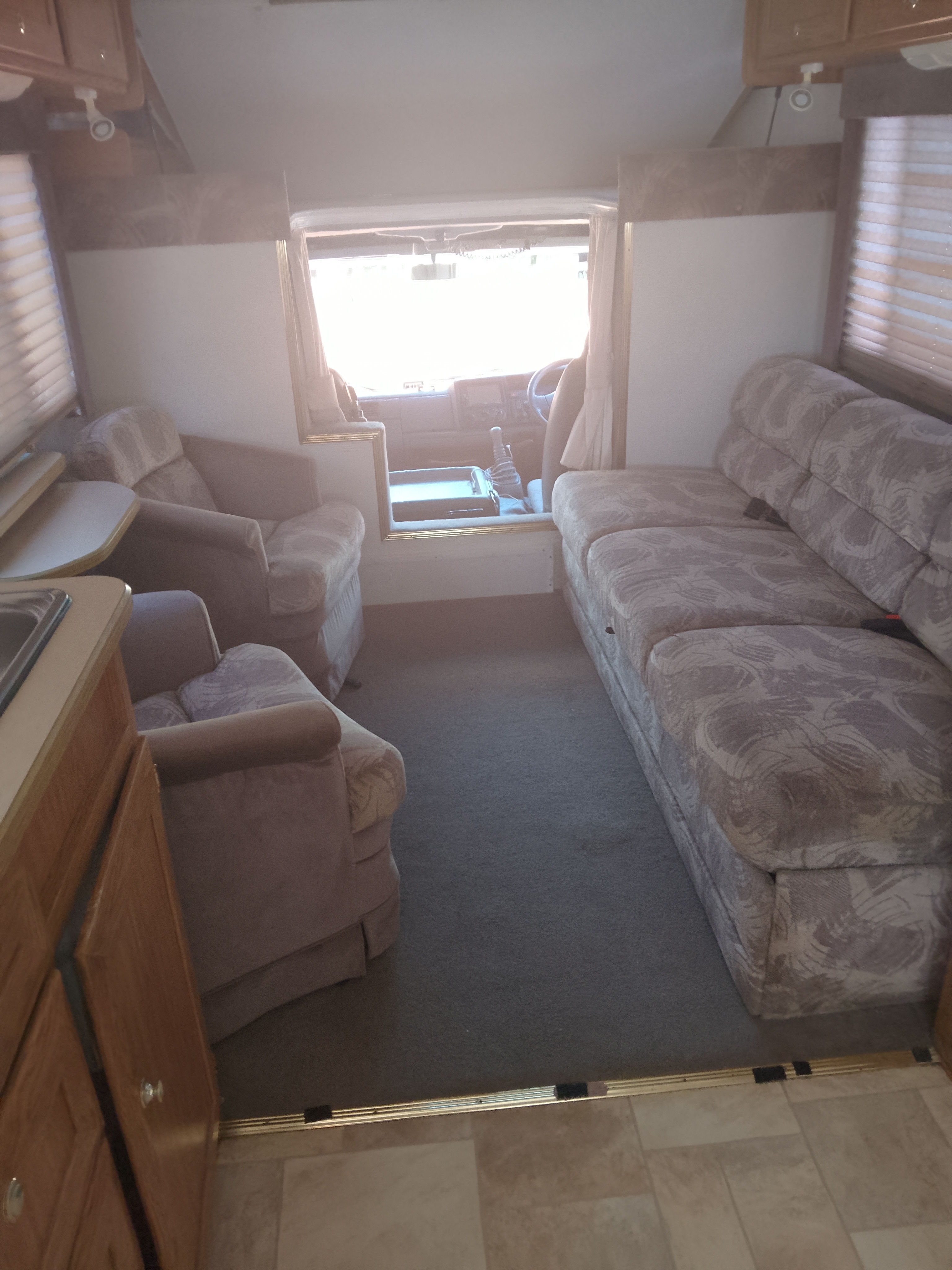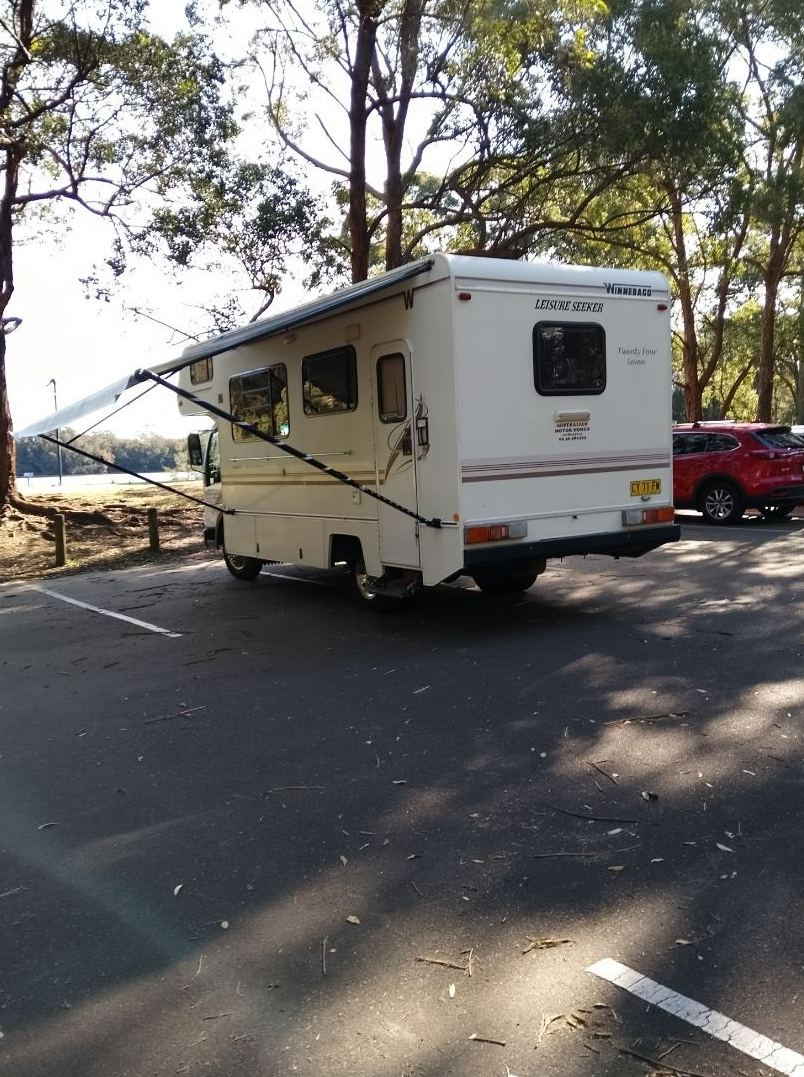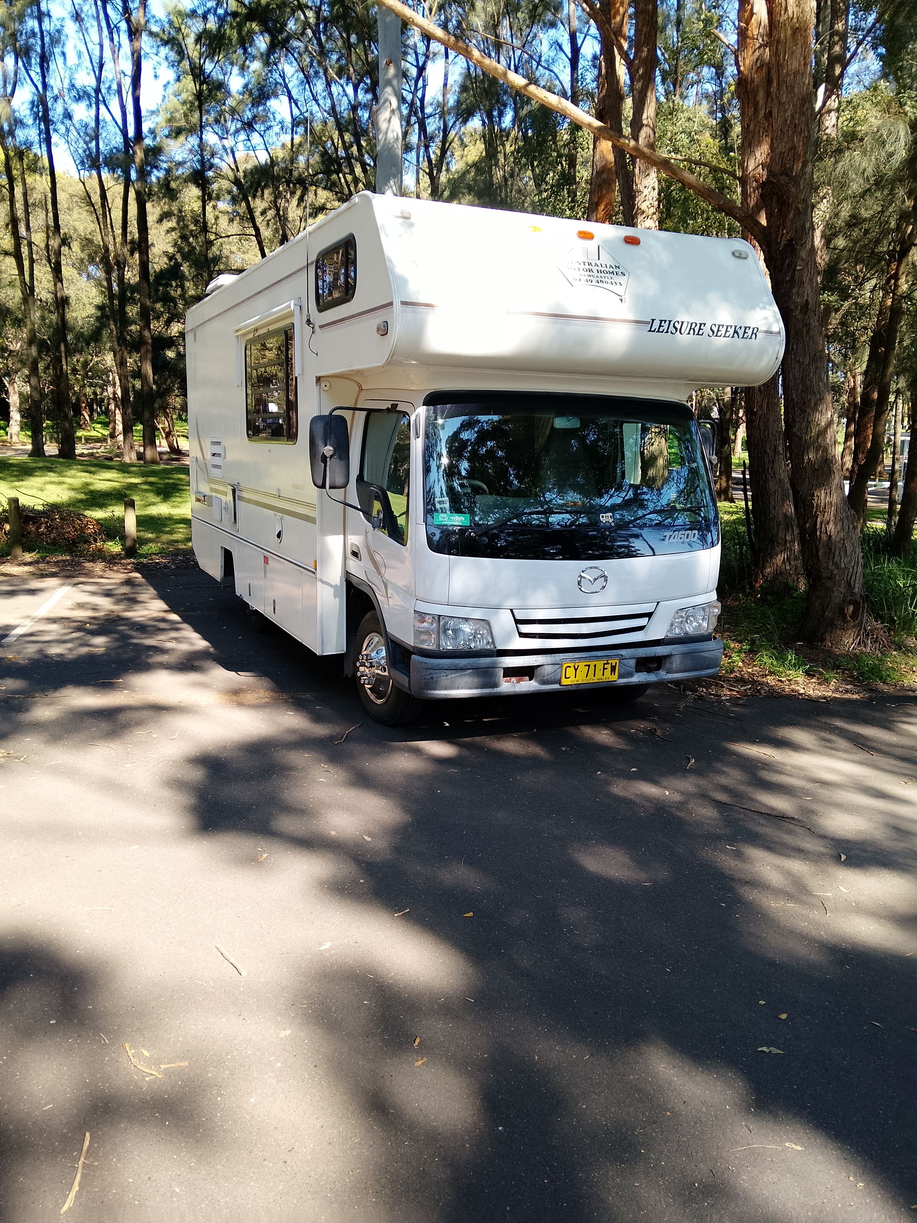 2002 Winnebago Leisure Seeker (model 2054) motorhome on a Mazda T4600, 5-speed manual diesel, only car licence required. This vehicle has only driven 175,000 kms and is in excellent condition. It is the ever-popular 2054 model in a restful tan/chocolate décor with a large 110L 3-way refrigerator with a new cooling system, a 300W inbuilt inverter, internal start hot water system, a new external and internal shower, all new plumbing, a new rollout awning and an extra awning on the driver’s side over the lounge window.