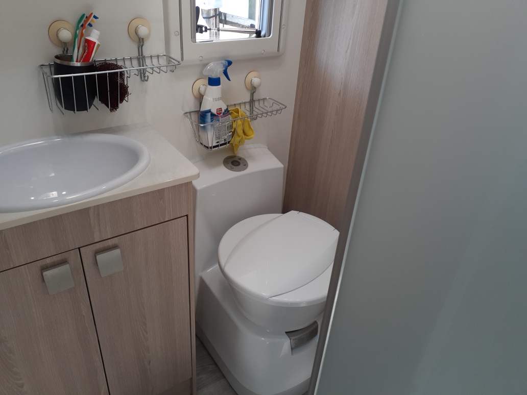 Seperate shower and toilet with storage and shelf space for all your toiletries.