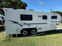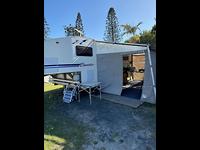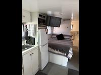 23ft fifth wheeler. Electric/gas hot water service, microwave, service under bed, gas hot plate, fridge, separate toilet and shower, full size annex and TV. 80 Litre fresh water and 1 gas bottle. Queen size bed. 1 house battery with trickle charger. Electric boat loader to mount tinny on roof.