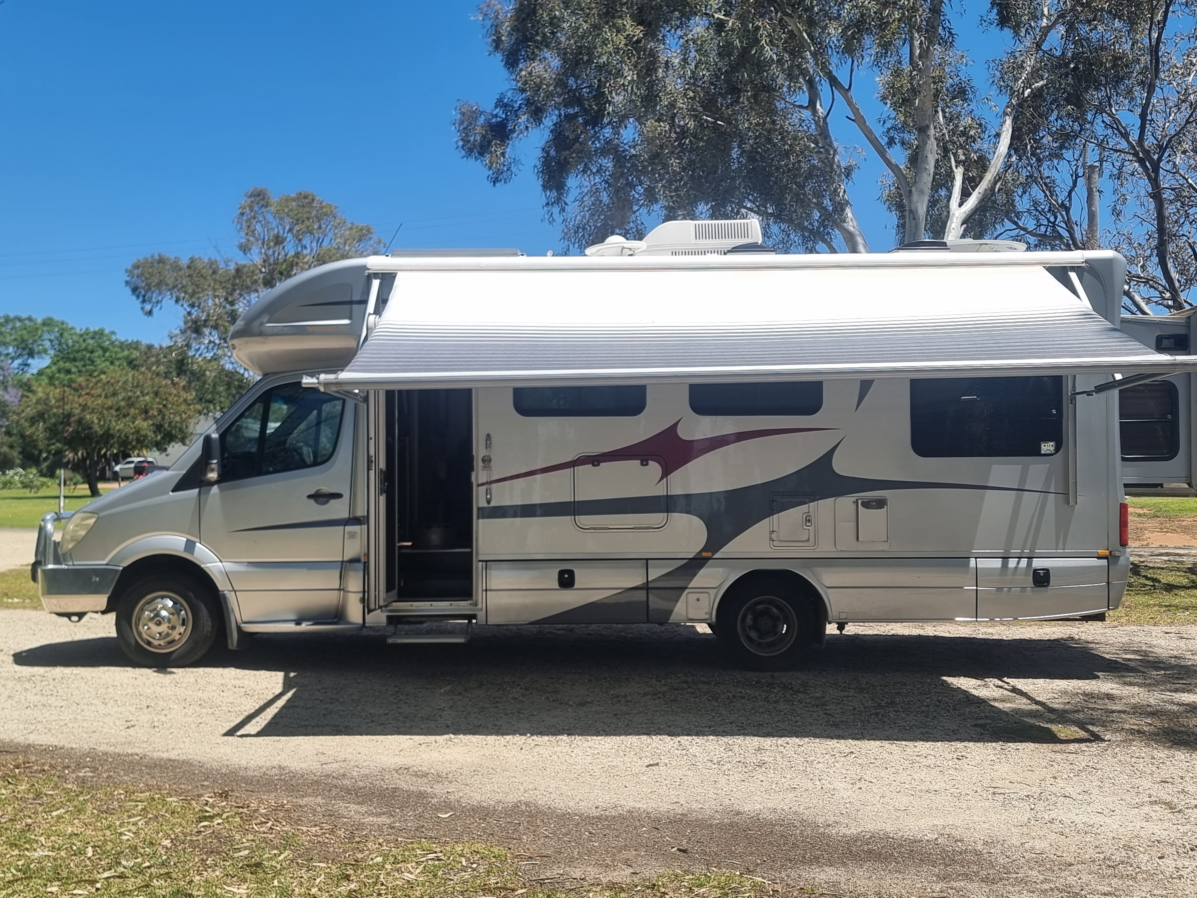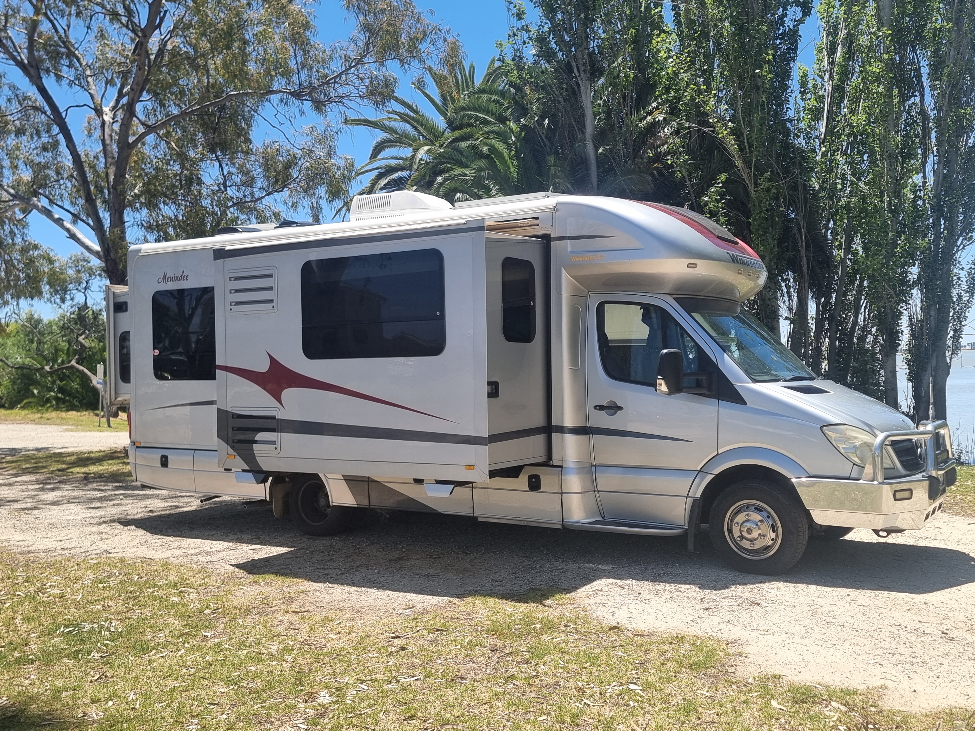 Winnebago Menindee/Mercedes, the ultimate in motorhomes, V6 mercedes diesel auto pleasure to drive, 118,000klms, service history, seats 4, leather heated front seats with massage function, seats swivel for extra space, 2 rev cameras, twin slide out bedroom and lounge, separate toilet/shower, the bedroom can be separated from the lounge, the toilet and shower can also be separated from the lounge, ducted r/c air con, diesel heater, 3 TV's with satellite, 2 electronic reversable fans in bedroom, fans in shower & toilet, huge electric awning, electric entry step, solar and batteries, 3 way replacement fridge, cook top oven, microwave, hot water, slideout storage drawers, inbuilt 3.8kva gen, rear air bag suspension & springs f&r upgraded gvm to 5500kg carrying capacity, tow cap 2800kg, larger fuel tank 90+ litres, roamsafe flywire security door, fresh & grey water tanks. Elect stabalisers, I have the rear chrome hub caps, new windscreen fitted next week, RWC for vic buy Gordon 0412890582.