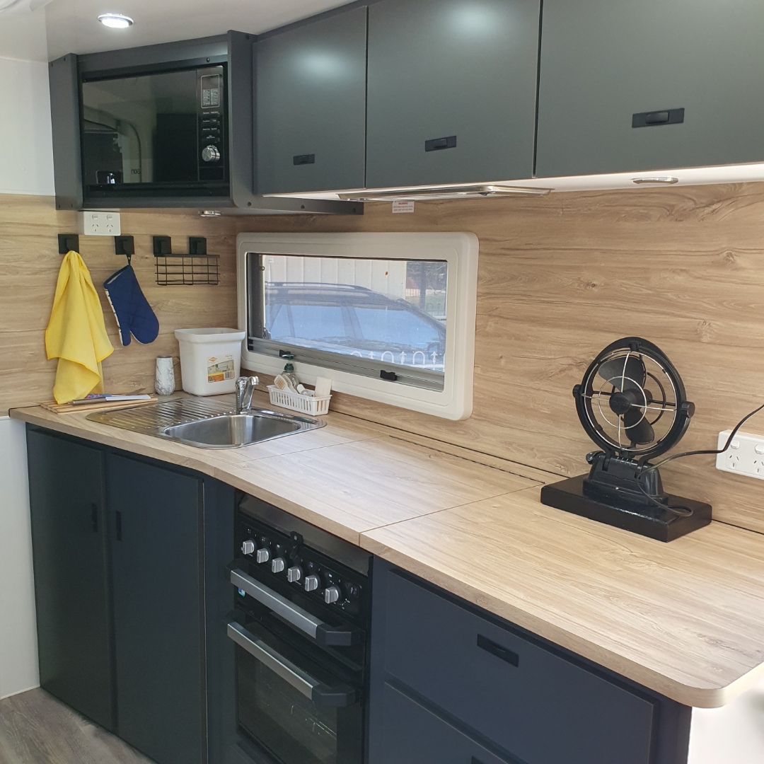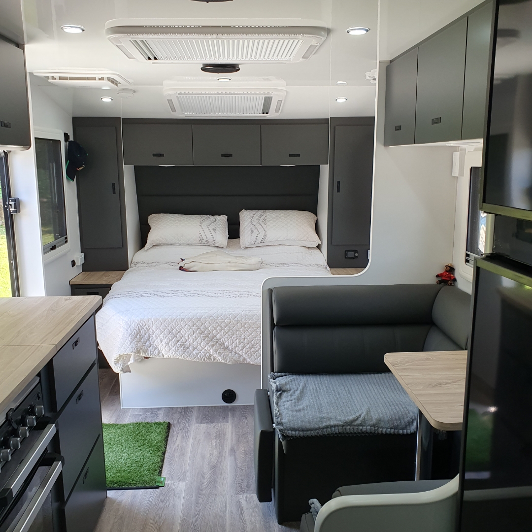 Appliances - Dometic 224Ltr compressor fridge, Dometic air conditioner, Thetford cassette toilet, washing machine, gas hotplate, grill and oven, 12v rangehood, 24" HD Smart LED tv, stereo.