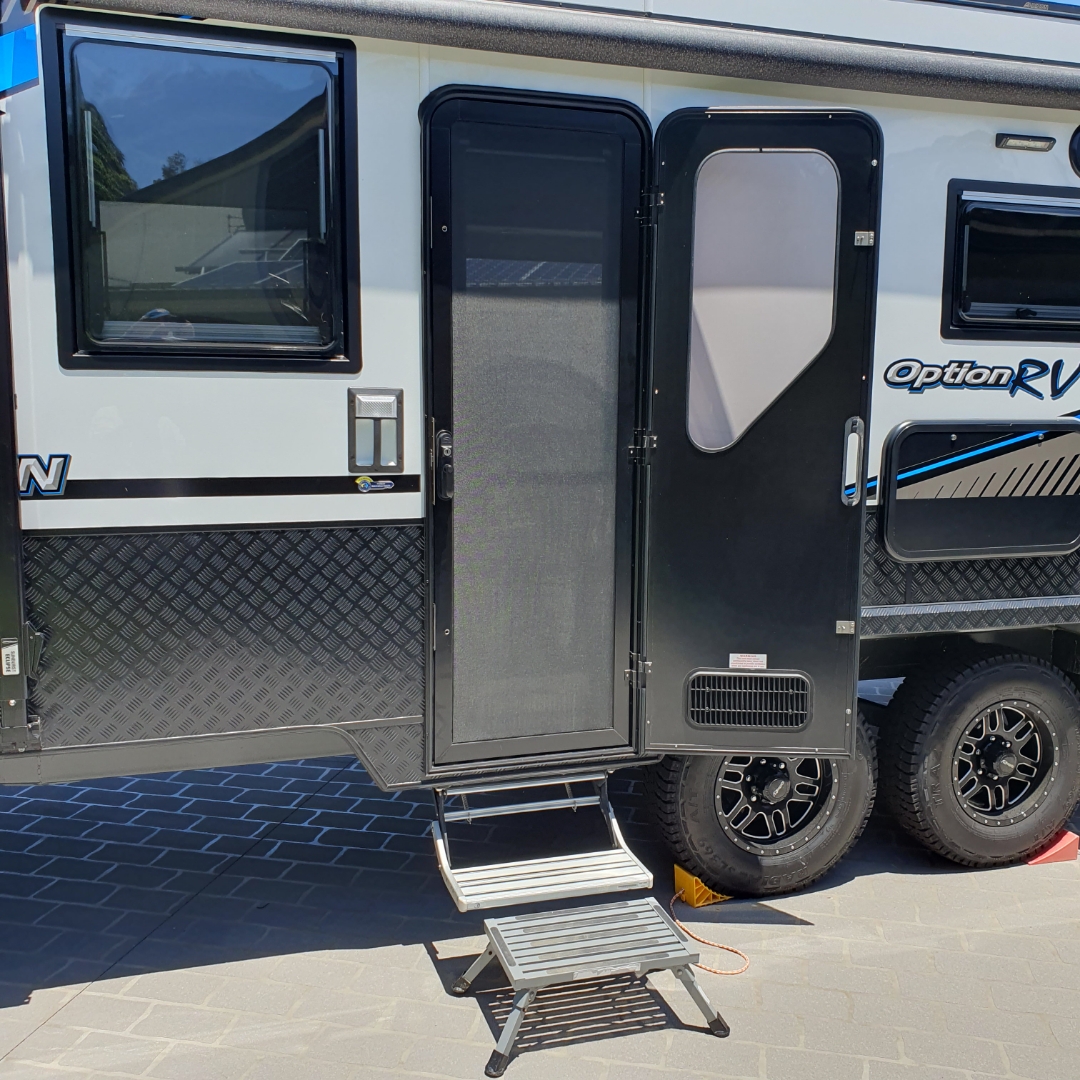 Exterior - composite panel classing, 27mm sandwich composite fiberglass roof, checker plate skirting, tunnel boot, awning, security mesh entry door, Dometic double glazed windows, fold down picnic table, skylight LED hatches, 12V LED fan hatches in ensuite, Anderson plugs,