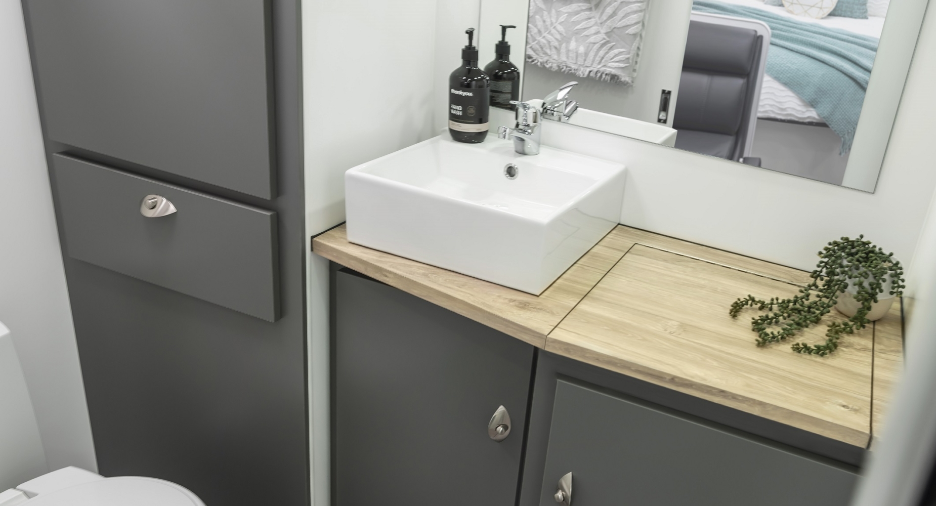 Interior - self locking catches cupboards, 25mm benchtops, lift up strut assisted posture slat bed base, Queen size bed pillow top mattress, sleeps 2, vanity mirror, basin, vinyl upholstery, fold up footrests, cafe dinette, slide out in tunnel boot, toolbox,